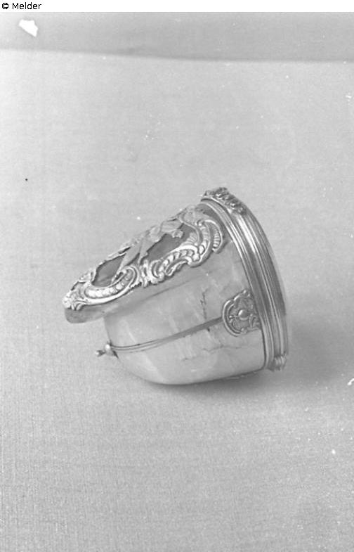 In shape of a helmet of a grenadier; made of amethyst at back white and in front purple. Cover made of same mineral. Mounting, fittings of the frontside of the helmet made of gold. Fittings: Trophies surrounded by rocailles. At front of the mounting of the rim of the cover golden branches are applied, garnished with diamonds and rubies. Mark: At rim of cover twice mark of crabs R.5906 inside an oval (import stamp of France, 1838 - 1864)