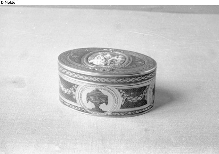 Oval, foldable cover. Made of gold, walls, bottom and cover engraved with guilloche pattern (laurel garlands, vases) partly covered with transparent green enamel. In the middle of the cover a small picture made of enamel in grisaille: Young man with two ladies under a tree on red ground. A moulded, golden frame. Smooth gold inside. Mark: Inside of cover and bottom: Jb. C crowned, Paris, 1766 -1767, not at R., Pz. R.6519, J.J. Prevost, 1762 - 1768, master sign CLB, Charles Le Bastier, Mr. 1751 - 1782 (R.6698), next 1417, at rim dogs head R.6516 (?)