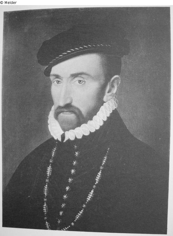 Half-length portrait of a bearded man in his younger years, with moustache and goatee, slightly turned to the left, black robe with ruff and pearl necklace, a beret on his head