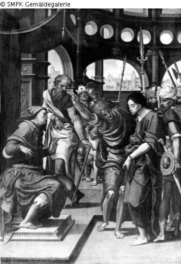 Tafelmalerei: Bild: im Palast des Kaiphas wird Christus von den Juden verspottet (Matthäus 26:67-68; Markus 14:65); Palast; Kaiphas; Juden