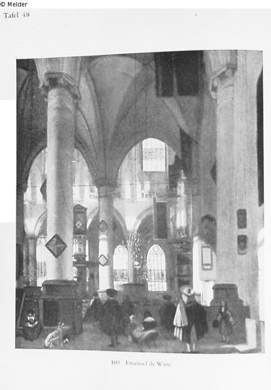 Blick von dem Seitenschiff in das Längsschiff mit der Orgel und der Kanzel links, auf der der Geistliche predigt. In braunen Kirchengestühl zahlreiche Zuhörer. Vorn verschiedene vom Rücken gesehene stehende und singende Figuren. Darunter im Vordergrund ein Herr in grauem, leuchtend rot eingefaßtem Mantel. Die Kirchenarchitektur wird vom breit einfallenden Sonnenlicht belebt. Goldener Rahmen. Aus der Staatlichen Gemäldegalerie in Kassel.