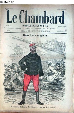 "Breitbeinig, mit Reiterhosen, Uniformjacke und Generalsmütze steht er da, General Gallifet, vor den Leichenbergen, die vor der Mauer gestapelt worden waren. Er hatte die Erschießung der Kommunarden an der Mauer des Friedhofs ‚Père Lachaise‘ befohlen. Fuchs beschreibt in seiner Karikaturengeschichte das Blatt folgendermaßen: Am Gedenktage der Juni-Schlacht präsentiert Steinlen den General Gallifet „Dans toute sa gloire – Frauen, Kinder, Greise, … nichts hat ihm zu widerstehen vermocht“, als er nämlich im Jahre 1871 als Versailler General die Füsilade der gefangenen Kommunarden besorgte." (UW)