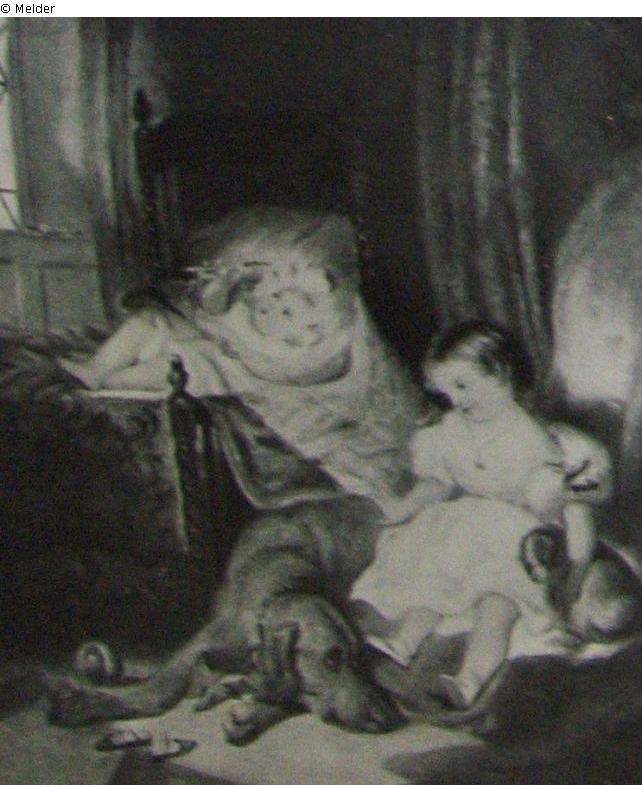 Ein kleines Mädchen streichelt mit der Rechten einen großen braunen Hund und hält im linken Arm ein König-Karlshündchen. Hinter ihr in einer Wiege ein spielender kleiner Knabe. G.-R. Signiert; gerahmt;