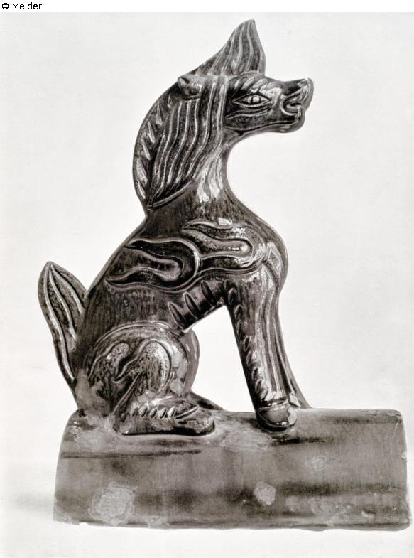 Fuchs text for plate 41: „Dachreiter. Pferd auf den Hinterbeinen hockend. Goldgelb glasiert, nur die Augäpfel schwarz. Höhe 29 cm." Literatur: Tafel 41: „Dachreiter. Pferd auf den Hinterbeinen hockend. Goldgelb glasiert, nur die Augäpfel schwarz. Höhe 29 cm.“