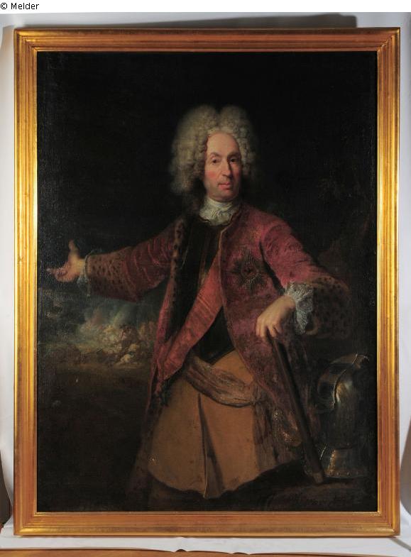 three-quarter-length portrait of the sitter with curly wig and dressed in contemporary fashion of the early 18th century with a broad sash and light-coloured neckcloth, the star of the Prussian Order of the Black Eagle on the lapel; the right hand outstretched pointing to the left side of the picture, the right supported on the staff of command; in the lower right corner a heavy metal helmet; in the left background a battle with an explosion and a rider on a rearing horse.