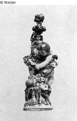 Katalog Hans W. Lange / Auktion 18.-19.11.1938, Kapitel "Dosen", S. 69: "544. Flakon in Form eines blütenbekränzten Baumes, über den sich ein Amor neigt, um ein auf einem Sockel liegendes Herz anzuschießen. Goldmontierung mit Kette. Blütenstrauß als Stöpsel. Chelsea, letztes Drittel 18. Jahrh. H. 9 cm. Tafel 38."