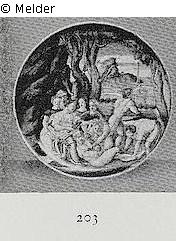 Samson and Delilah. Samson with his head in the lap of Delilah, who cut off his hair; the Philistines have bound him and are going to carry him away. Under the floor: Sinsone viene Ligato p. Dalila. In Urbino 1535. Broken. Reference: Paul Graupe: Gemälde, Kunstgewerbe aus verschiedenem Besitz, Ostasiatisches Porzellan aus dem Besitz der Prinz-Albrecht-Linie des vormals Preußischen Königshauses und aus drei Privatsammlungen. Auktion vom 20. und 21.10.1936. Berlin 1936.