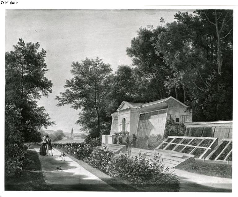 Sourrounding of Vienna with figures as staffage, copuple with a boy. Framed, signed and dated 1830.