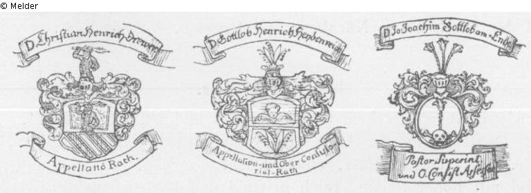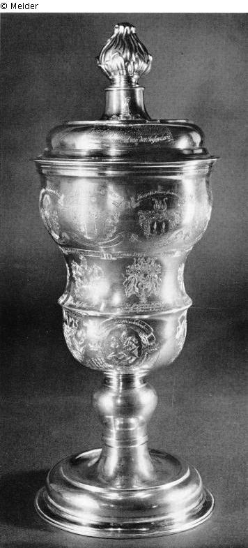 Heavy lidded goblet with curved bowl. Entirely covered with engraved coats of arms and inscriptions on ribbons in three rows. In the first row are the following names and the assembled coats of arms (omitting the known noble). Dr. Francisc. Friedrich Tittmann / Hoff- Berg- Rath u. Leib- Medicϧ. Bernhard Reichs Graff von Zech. / Geheimer Conferenz Ministre u. / Würcklicher Geheimer Rath. Johann Heinrich v. Heucher / Hoff Rath und Leib Medicϧ. Philipp Friedrich Trier. / Hoff- Ober Rechnungs. u. / Berg- Rath. D. Carl Wilhelm Gärtner. / Apellation Rath. August Franz Essenius, / Hoff- und Justitien Rath / auch Ober Amtmann.D. Christian Heinrich Drewer. / Appellatiō Rath.D. Gottlob Heinrich Heydenreich / Appellation- und Ober Consistorial- Rath. Carl Sigmund von Nimptsch / Geh: Camer Rath u. Camer Herr a. 1747. The second row has subsequent names and their coats of arms, including the civil one: Joh: Friedr: Reichs Graff v. Schönberg / Geheimer Conferenz Ministre und / Würcklicher Geheimer Rath / des Ruſs: Kayser: St: Andreas Ordens Ritter. D. Jo. Joachim Gottlob am - Ende / Pastor,Superint. und O. Consist. Asſesſor. Carl Friedrich von Schönberg. / Erster Hof. Marschall. Thomas Frey Herr von Fritsch / Geheimder Conferenz Minister und / WürcklicherGeheimder Rath / der Pohln. weiſsen Adler u. St. Stanislai Orden- Ritter. Hanns Gotthelff von Globig. / Würcklicher Geheimder Rath / und Ober-Consitorial-Praesident. August Friedrich Freyherr v. Ende. / Churfl. Sachsis. Appellat. Gerichts.-Praesident. The third row with the corresponding coats of arms: Johann Friedris. Sohn Adolph Heinrich / Grafen v. Schönberg, Churfl.-Saechsis: Cantzler. Hans Adolph v. Carlowiz / auf Stoesiz / Churf. Saechsischer Camer-Herr. Friedrich Gottlob von Berlepsch / Churf. Saechs. Geheimd. Camer Rath. Adam Rudolph v. Schönberg / Chur=Fürstl.=Saechs: Würcklicher Geheimder / Rath u. General Post Meister, des St: Johanis / zu Maltha, und Königl: Daenischen v. Daneborg Ordens Ritter Designirter / Commendator uff Lagow. Post Meister, des St: Johanis / zu Maltha, und Königl: Daenischen v. Danebrog Ordens Ritter Designirter / Commendator uff Lagow. Christoph Friedrich v: Flemming / General Major: u. Vice Kr: Raths. Praesid. Detlev Carl Graf von Einsiedel / Churfürstl. Sächsi: Ober: Steuer: Director. On the cover: Peter August v. Schönberg / Haus.-Marschal, wie auch / Ober - Aufseher derer Flösſen.Carl August von Gersdorff / Cabinets - Ministre und Staats- Secre= / taire auch General von der Infanterie.Marked on the cover's rim with Dresden assay mark and a makers mark.