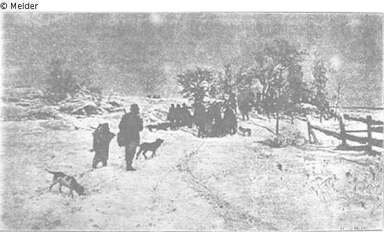 Verschneite Landschaft, ein klarer Wintertag, im Vordergrund Weidmänner mit ihrer Jagdbeute (Hasen), im Hintergrund: Wald, im Mittelgrund ein Jäger, der seinen Hund pfeift; Rahmen: Außenmaß: 105 x 130 cm