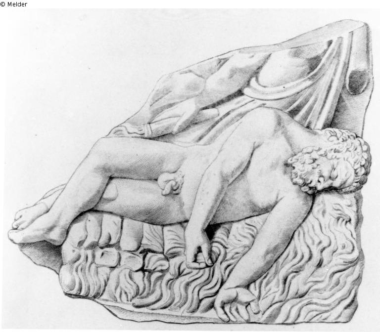 Fragment of a sarcophagus front; A nude man (Heracles) lying lifeless on already burning logs, behind him a person with a torch in his lowered right hand