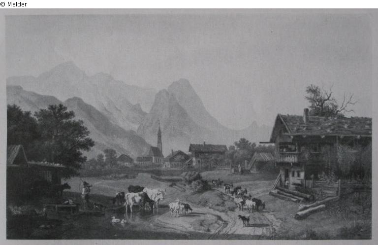 An einem Bache Kühe mit Hirten auf dem Wege rechts davon trosst eine Ziegenherde. Am rechten Bildrande ein Bauernhaus. Blick in das breite Tal mit Dorfsiedelung, dahinter die Bergkette.
