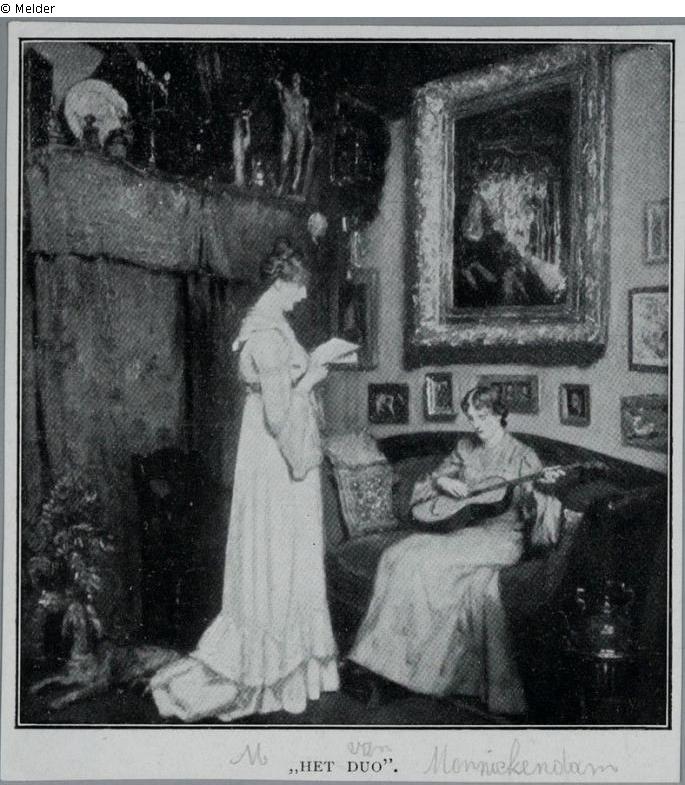 Signed and dated. Inscription 1908. Ladies making music in an artistically furnished interior, a girl, in white gown, stands singing from a sheet of music, while another girl seated on a canapé, accompanies her with a guitar.
