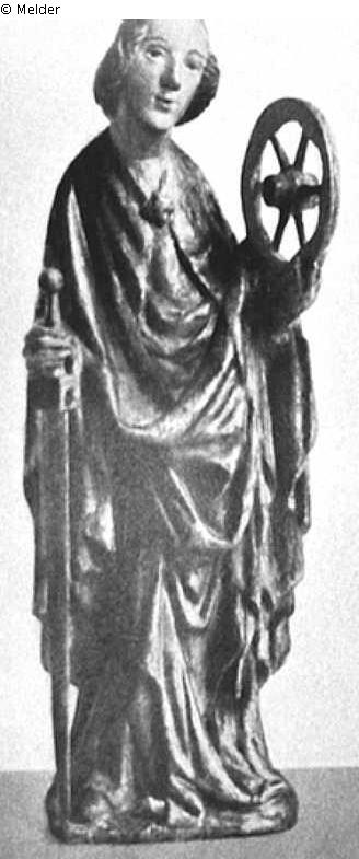 Heilige Katharina, flehend, auf dem linken Arm das Rad haltend, die Rechte auf ein Schwert gestützt, in faltenreichem, vergoldetem, blau gefüttertem Mantel über rotem Gewand. Das Haar auf dem Rücken zu langem Zopf verflochten. Lindenholz, vollrund geschnitzt. Der ursprüngliche Kopfschmuck fehlt. Böhmen