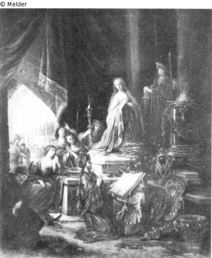 Is depicted in a temple on a high altar. To the left of the altar steps are some women. In the foreground is a kneeling priest with a large book at prayer. To the right Jephah seated near a wall.