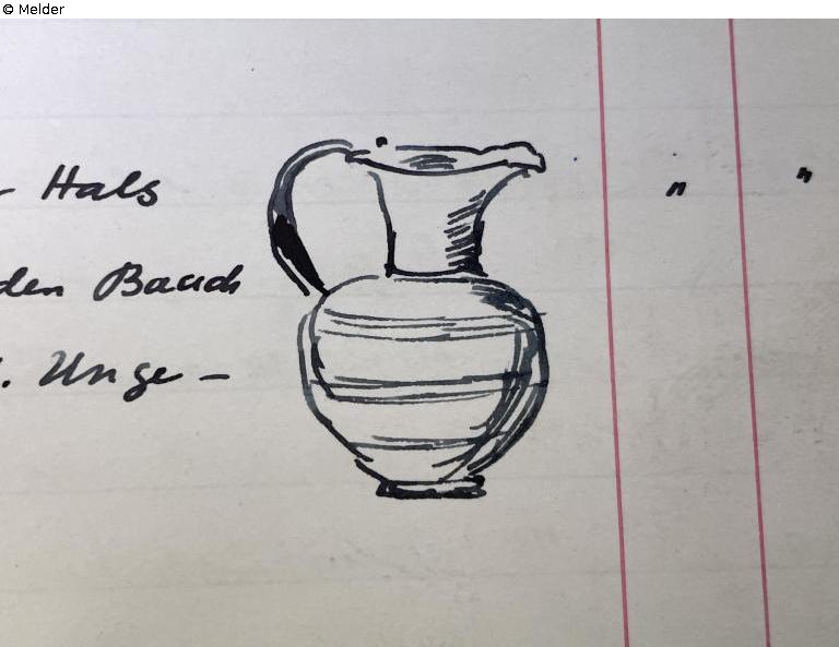 Jug, black clay, matching T 3283: high neck, mouth slightly indented at the front, 3 groups of parallel lines around the body, unbroken