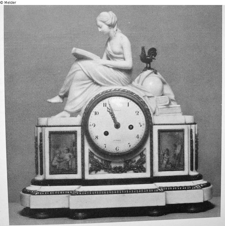 Louis XVI-Stil; weißer Marmor mit Goldbronze; auf der Vorderseite des abgestuften und abgerundeten Sockels kleine Puttenszene aufgemalt; bekrönt von der Marmorfigur eines lesenden Mädchens.