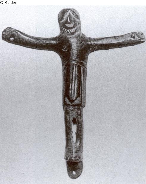 Bronze oder Messing-Kruzifix, roh gearbeitet aber mit expressiver Gestalt, lt. Inv.-Buch: "gotisch, noch mit romanischen Einflüssen, Kopf sehr stilisiert, Füsse nebeneinander nicht gekreuzt, an den Händen und Füssen sind Löcher zum Festmachen d. Kruzifixes" Bodenfund aus Beeskow