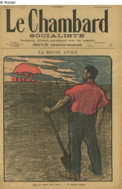 "Mit dem Rücken zum Betrachter schaut ein bärtiger Arbeiter mit hochgekrempeltem Hemd einem Sonnenaufgang zu. Das ist eine interessante Komposition, denn dadurch nimmt der Betrachter die gleiche Perspektive ein (Solidarisierung des Lesers). Das Naturspektakel ist für ihn voller Symbolik: Leuchtend rot strahlt das Gestirn und auf der Sonne steht die Zahl 1894. Was wird im neuen Jahr auf die Arbeiterbewegung zu kommen? Sich seiner Kraft bewusst, stützt er sich auf einen Spaten und er schaut in Richtung der Fabrikschlote, die mit dichtem Rauch die Sonne verdunkeln. Unter ihm drei Fragezeichen – was wird die Zukunft bringen." (UW)