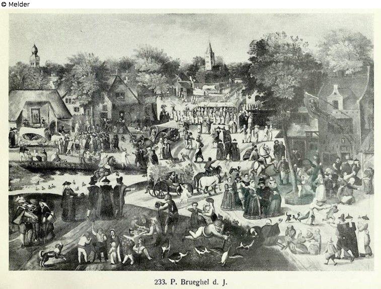 LARGE FARM FUN the church square of a small town, occupied by stalls, with a dense crowd of wagons, riders, walkers, groups of farmers, dancers and players is busy. Brown frame.
