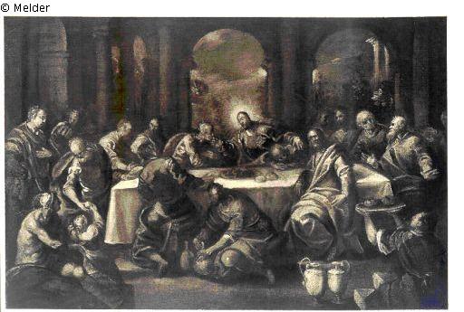 Ölbild kirchlicher Bestimmung. Abendmahlszene. Vor einer dunklen Bogenarchitektur steht der Abendmahltisch, umgeben von sitzenden Aposteln in bewegter Haltung. In der Mitte Christus mit Heiligenschein. Vorne bewegte Nebenfiguren mit Trinkgefäßen und Lebensmitteln wie zu einem Festmahl. Die tiefen Farbtöne nur durch ein helles Tischtuch unterbrochen. Alle Figuren heftig erregt und von sehr unruhigem Umriß. Breite andeutungsweise Darstellung.