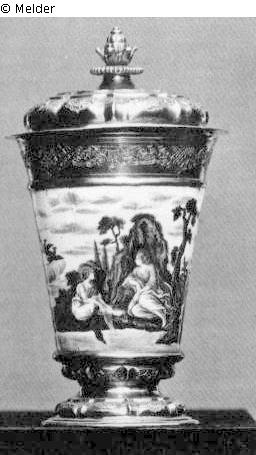 One of four conical lidded beakers; domed lid with knob in the shape of a leaf bud; lid, rim and foot decorated with leaf work and strapwork; mythological scenes as enamel painting around the circumference of the wall.