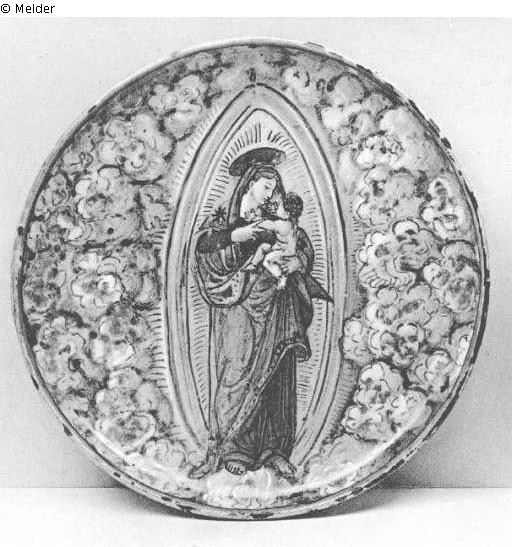 A RARE GUBBIO LUSTRED DISH, by Maestro Giorgio Andreoli, decorated with a full-length figure of the Madonna and Child in blue and ruby lustre against a golden mandorla among clouds in grey, gold and red lustre, the underside with two concentric circles and four leaf spraj/s in gold lustre, the centre of the foot with the initials and date MG, 1530
