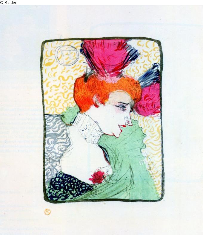 olive green drawing and yellow, grey, vermilion, crimson, turquoise, dark blue, ochre; edition of 1211 copies, here: 3rd status with writing not designed by Lautrec on the lower left margin: >Original lithograph in eight colours by H. de Toulouse-Lautrec< Pan. Volume 1, issue 3, 1895, p. 196-197