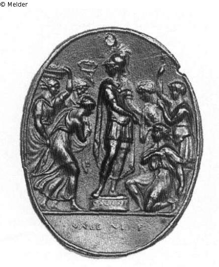 Ovale Plakette, rechts oben bestoßen, schmale Randleiste, oben eine Durchbohrung. In der Mitte auf niedrigem Postament mit der Inschrift P SCIP AFR steht Scipio, der mit Helm, Panzer und Mantel bekleidet ist. Er blickt nach links auf das Mädchen, das sich vor ihm verneigt, und weist ihr den Bräutigam, der rechts neben ihm kniet. Dahinter führt ein Soldat mit Lanze einen Gefangenen vor sich her. Links hinter dem Mädchen treten ein bärtiger Alter mit einer Truhe und eine Frau mit einer Schale heran. Im Abschnitt liest man die Signatur VALE VI F.