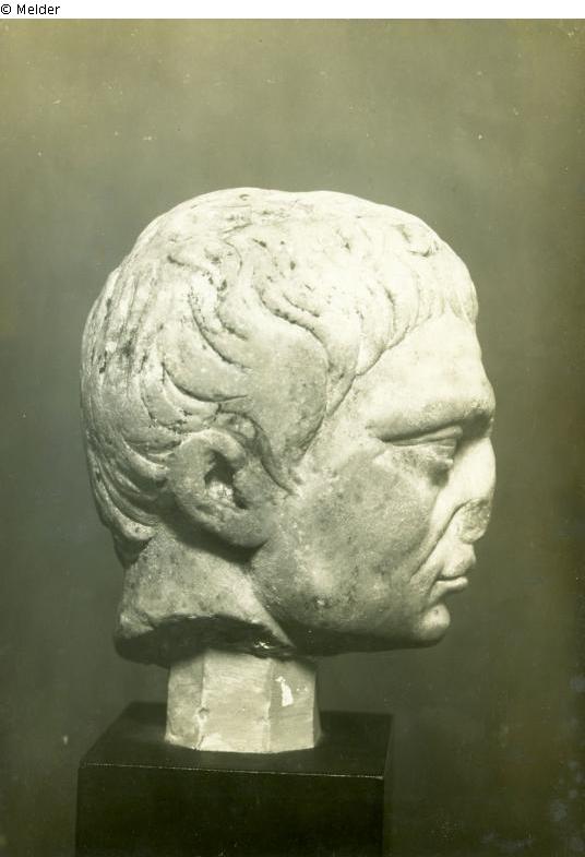 Male head; short, neck-length hair; nose cut off; pronounced nasolabial folds.