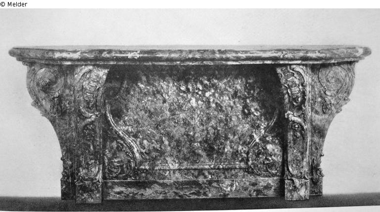 Schanktisch; Louis XV. Rot-weißer Marmor, reich skulptiert mit Muschelwerk, Voluten, Kehl- und Schanktisch; Profilstäben. Die geschweifte Platte ruht auf zwei Wangen und einer Wandsockelplatte