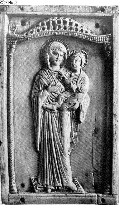 Rectangular with a figure of the Virgin Mary, the Christ Child in her arms, standing under an arcade, carved in shallow relief. Eight nail holes on the narrow sides, crack at the bottom right