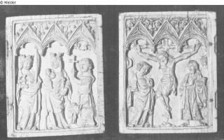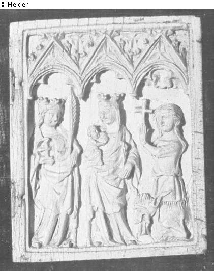 Maria mit Kind zw. 2 hl. Frauen (Hl. Katharina und Margarethe); 14.Jh., Elfenbeinrelief unter 3 got. Baldachinen (Teil eines Diptychon), 6,2x4,8cm