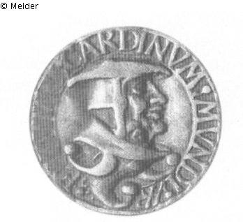 Medaille. Vs.: Doppelkopf Kardinal und Narr, Umschrift: EFFIGIES CARDINVM MVNDI und die Signatur HR (ligiert). Rs.: Inschrift: EFFE= / MINIATI / DOMINA= / BVNTVR / EIS / 1544. Das Tridentiner Konzil, auf das sich die Medaille beziehen soll, begann erst am Ende des nachfolgenden Jahres.