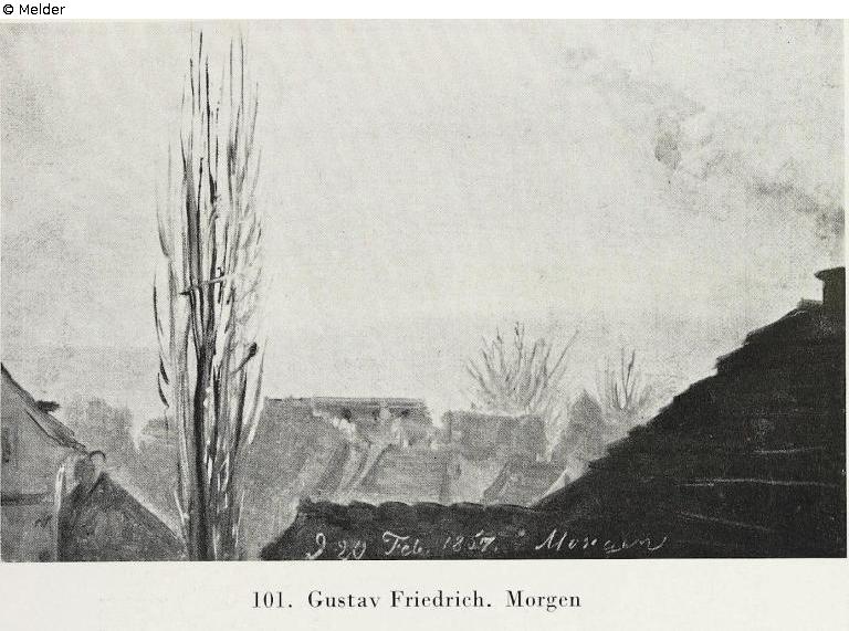 View from the window to the house roofs and trees. Inscribed below: "d. Feb. 20, 1857, morning". Shown by W. Wolfradt: Caspar David Friedrich, p. 184.