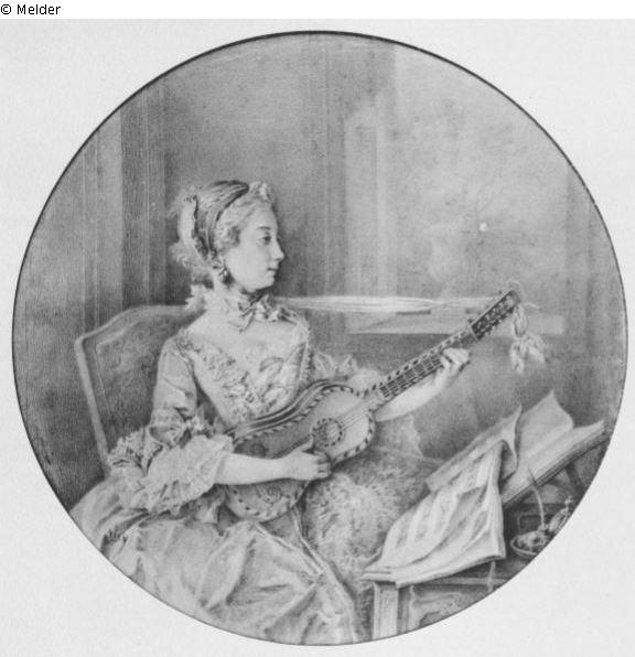 young woman playing the guitar, sheets of music in front of her; round wooden, golden frame, style Louis XVI, a bow at the top in the middle