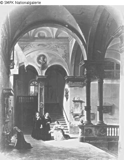 Panel painting: Picture: Abbey, monastery, convent in the Roman Catholic Church & nun(s) & kneeling on both knees (female figure)