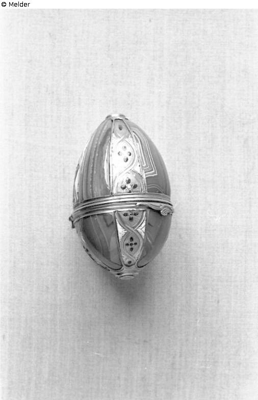 In shape of a hens egg, across departed, foldable cover. Formed by alternating panels of brown-grey striped agate and gold with ornaments made of white and green enamel. Hinge and rims made of gold with rocaille-ornaments. Mark: At rim of cover twice a stamp of owls R.6615 (import sign, France since 1893)