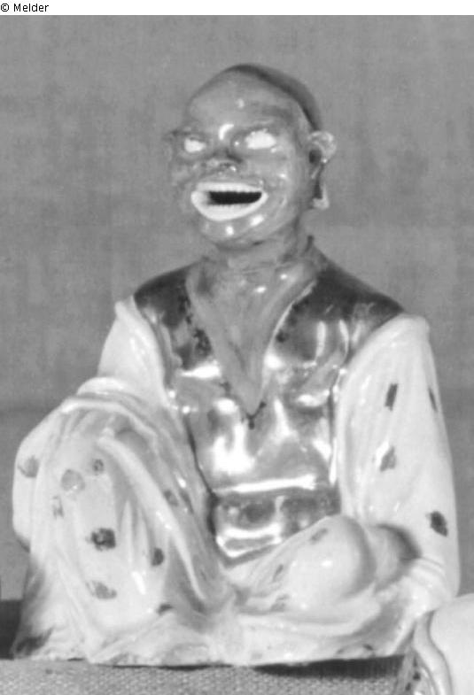 Supplement Oppenheimer: Sitzender Chinese als Brûle-Parfum, Gesicht und Hals helllila, goldene Krone und Brust, mit Gewand mit goldenen Blumen