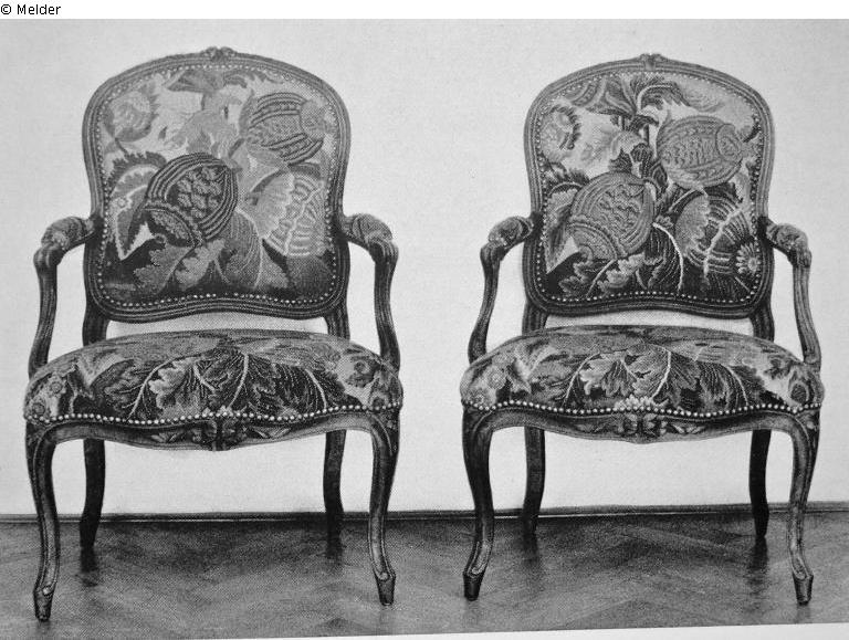 mit Pointbezug. Nussholz. Geschweifte, geschnitzte braune Gestelle. Der Bezug mit grossem Früchte- und Blättermuster