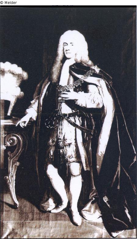 A full-length portrait of a man, standing slightly turned to the right and looking towards the viewer, wearing the costume of a knight of the Order of the Garter and the wig of the "wigs", with a long ermine-trimmed cloak falling to the ground, above him the golden chain of the Order, under the left knee the ribbon of the Order; holding the left hand with spread fingers under the breast, showing the right hand in front of an ornamented rococo table shown cropped at the left edge of the picture, on which lies the feathered hat of a member of the Order of the Garter.