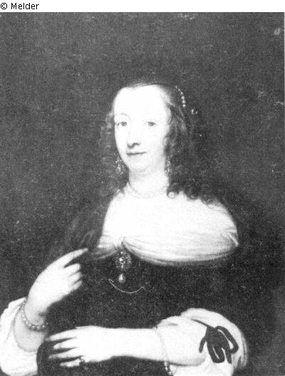 Bust length portrait of a woman in a black dress trimmed with a white cloth across the shoulders. In the hair, on her neck and on her hands are strings of pearls.