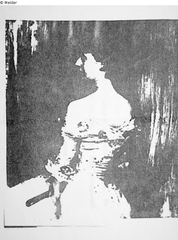 geb. Livingston; vor graugrünem Hintergrund stehend, bis zu den Hüften. Rückenansicht im dekolletiertem weißen Kleid, in den Händen einen großen weißen Federfächer. Der Kopf ist nach links zur Seiten gedreht, die braunen Haare hoch frisiert. Bez.r.seitlich: Franz Stuck 1900