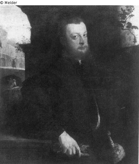 Panel painting: Depiction: Portrait of an anonymous historical person (alone) & adult male & prospectus of a town, town panorama, silhouette of a town; Portrait; historical person (anonymous); male; historical person & adult & panorama; silhouette; Signature: Lower left: AETATIS.23.A.153(6); Dimensions: 106 x 88 cm.