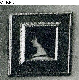 Profilkopf der Frau Braun mit dreifacher goldener Kette im braunen Haar, bezeichnet