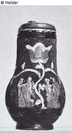Bulbous shape with brown speckled glaze and relief floral tendrils extending symmetrically from the centre, with figures of the Virgin Mary, saints, etc. in between.