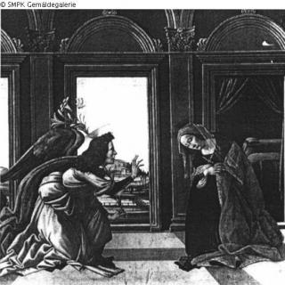 Tafelmalerei: Bild: die Verkündigung: Maria steht (Maria zur Linken, der Engel zur Rechten); Verkündigung; Maria (Jungfrau); Gabriel; stehen