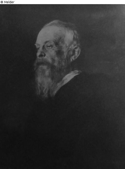 Life-size portrait without hands - two-thirds profile to the left, facing to the left in front - in a dark skirt with a light collar. Light from the front left. Bright light on forehead and white collar. Strong meat tone, predominantly red and brown. Gray hair, reddish gray beard, black suit, dark brown background. Signed on the left side: F. Lenbach 1902.