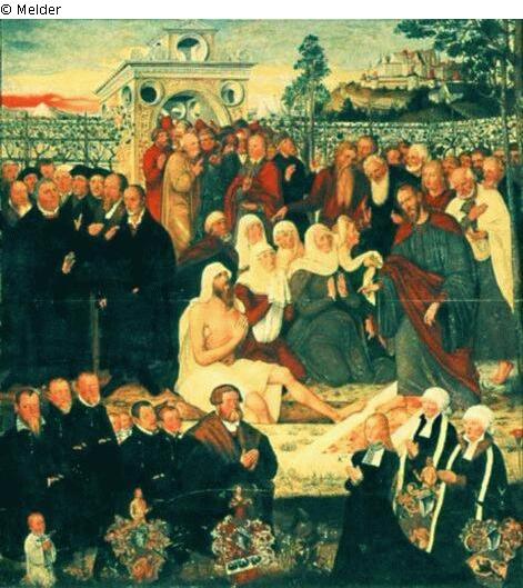 Oben und im größeren Teil der Mitte ist die Auferstehung des Lazerus dargestellt. Darstellung von ca. 60 Personen: In der Mitte rechts stehen die bedeutendsten Reformatoren, voran Luther und Melanchthon, dann Justus Jonas, Johann Bugenhagen, Georg Spalatin, Johann Spangenberg und andere. Unten im Vordergrund kniet der Bürgermeister Michael Meyenburg mit seiner Familie, selbst durch ein Wappen ausgezeichnet. Unter dem Malerzeichen L. Cranachs steht die Jahreszahl 1558.