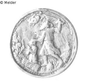 Medaille, gehenkelt. Vs.: Abraham ergreift den Kopf seines Sohnes, der links auf dem Holzbündel kniet, und schwingt das Krummschwert, das ein herbeischwebender Engel festhält. Unten die Inschrift ABRAAM OFFERT [FI]LIV[M SVVM]...Rs.: In der Mitte sieht man Christus am Kreuz, links drei Frauen, rechts einen Soldaten und einen Reiter mit Lanze. Im Abschnitt die Inschrift MISERERE MEI DE ... Beiderseits des Kreuzstamms die Signatur HR. Diese kleine Medaille stammt aus der Werkstatt des Hans Reinhart.